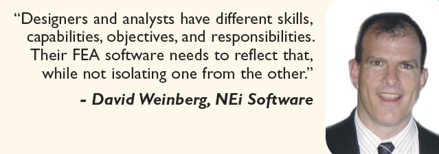 Weinberg agrees that a user friendly CAD environment can help designers accomplish their analysis goals. “The introduction of CAD-based FE tools has not at all diminished the role of the dedicated analyst. What FEA within CAD has accomplished is to extend the benefit of simulation to a different and earlier point in the product development process,” he explained. “The ‘dinosaur’ is any FEA system that does not have a common solver platform that can be shared by both designers and analysts. Designers and analysts have different skills, capabilities, objectives, and responsibilities. Their FEA software needs to reflect that, while not isolating one from the other.”