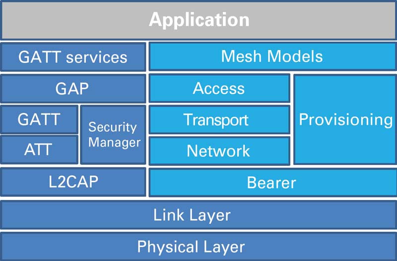 The Bluetooth mesh profile is tailor-made for smart lighting. There are a number of standard generic models including a Generic OnOff Server (e.g., light on or off) and Generic Level Server (e.g., light brightness or light hue) that specifically target smart lighting. Several other predefined generic models can be combined to create more specialized solutions.