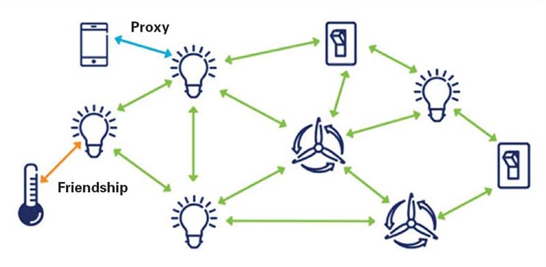 Owing to the legacy of BLE operation, very low-power, battery-operated devices can be operated at a low duty cycle to preserve battery life. In this case, the device will spend a considerable amount of time in sleep state. In order to facilitate command and control of these types of nodes, there is a “friend” feature that is possible in designated devices. This implements a store-and-forward feature to buffer messages to the low-power node for delivery when the low-power node checks into the network again. So, the low-power device is essentially a “push” device that initiates message transfer and then receives any outstanding message traffic from the friend node at that time.