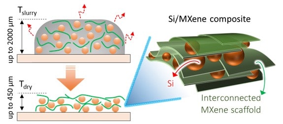 By mixing silicon powder into a MXene solution to create a hybrid silicon-MXene anode, MXene nanosheets distribute randomly and form a continuous network while wrapping around the silicon particles, thus acting as conductive additive and binder at the same time. It’s the MXene framework that also imposes order on ions as they arrive and prevents the anode from expanding. MXenes are a key to helping silicon reach its potential in batteries because, since they are two-dimensional materials, there is more room for the ions in the anode and they can move more quickly into it, thus improving both the capacity and conductivity of the electrode. They also have excellent mechanical strength, so silicon-MXene anodes are also quite durable up to 450 microns thickness.