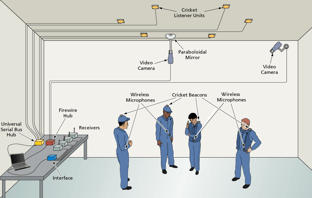 The data-acquisition hardware of the CAA (see figure) includes two video cameras: an overhead one aimed upward at a paraboloidal mirror on the ceiling and one mounted on a wall aimed in a downward slant toward the crew area. As many as four wireless microphones can be worn by crew members. The audio signals received from the microphones are digitized, then compressed in preparation for storage. Approximate locations of as many as four crew members are measured by use of a Cricket indoor location system. [The Cricket indoor location system includes ultrasonic/radio beacon and listener units. A Cricket beacon (in this case, worn by a crew member) simultaneously transmits a pulse of ultrasound and a radio signal that contains identifying information. Each Cricket listener unit measures the difference between the times of reception of the ultrasound and radio signals from an identified beacon. Assuming essentially instantaneous propagation of the radio signal, the distance between that beacon and the listener unit is estimated from this time difference and the speed of sound in air.] In this system, six Cricket listener units are mounted in various positions on the ceiling, and as many as four Cricket beacons are attached to crew members. The three-dimensional position of each Cricket beacon can be estimated from the time-difference readings of that beacon from at least three Cricket listener units.