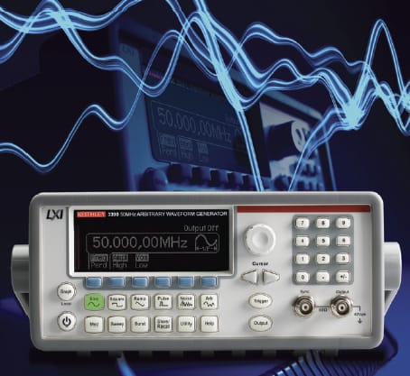 Keithley Instruments, Cleveland, OH, has introduced the Model 3390 50- MHz arbitrary waveform/function generator, a programmable signal generator with function, pulse, and arbitrary waveform capabilities. Features include 50-MHz maximum sine wave frequency, 25 MHz pulse frequency with 10-nanosecod minimum width, and 256K, 14-bit resolution arbitrary waveform generation. The built-in function generator includes capabilities such as sine, square, triangle, noise, and DC. The unit incorporates LXI Class C-compliant Ethernet, with USB and standard GPIB interfaces, as well as built-in AM, FM, PM, FSK, and PWM modulation. Pulses and square waves feature less than 10-nanosecond rise/fall times. A 10-MHz external time base is included for multiple-unit synchronization. The unit includes KiWAVE software, a waveform creation utility for creating custom arbitrary waveforms and managing waveform memory. It enables users to view waveforms in real units and perform waveform editing.