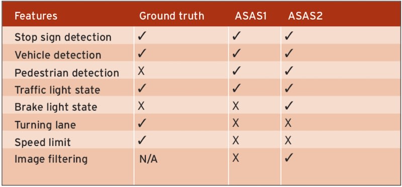 A combination of custom and known algorithms, called ADAS1 and ADAS2, was developed to automatically capture the ADAS EMS prediction features. Only ADAS information that could be obtained from a stereo vision camera was obtained. The features of ADAS1 and 2 and the ground truth selection are shown in the table below.