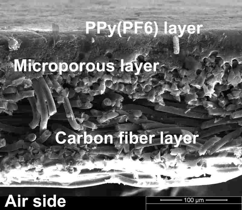 The new design allows air to enter the battery through a fibrous carbon layer. The air then meets a second, slightly less porous layer, and finally ends at a third one, which is barely porous at all.