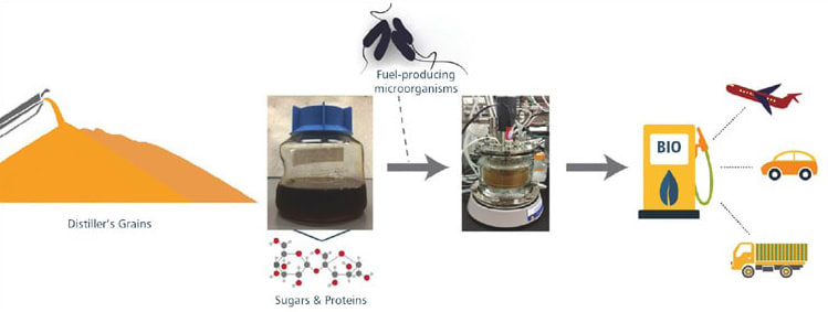 While other competing bioconversion processes focus on conversion of the sugar fraction of DGS to fuel, this process simultaneously converts both carbohydrates and proteins — significantly increasing yields and minimizing separation costs. The process involves dilute acid hydrolysis and genetically modified E.coli strains optimized for conversion of hydrolyzed carbohydrates and proteins.