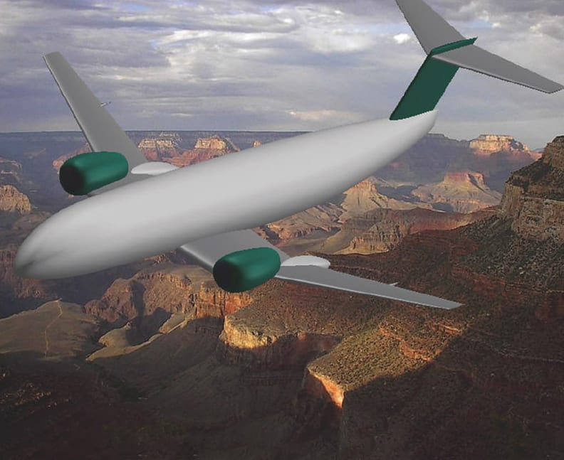 NASA’s Langley Research Center has developed a new aircraft design with the engine nacelle over the wing, improving engine ground clearance and freeing landing gear design. While previous over-the-wing designs have produced unacceptably high drag conditions, the new NASA design reduces drag on the wing. By optimizing the nacelle design and the wing leading edge location, NASA’s design confines the shock to the leading edge of the wing. Also, placing the exhaust nozzle over the wing reduces noise to the communities below.
