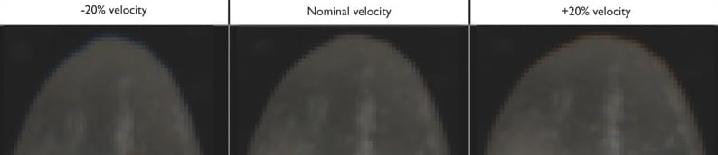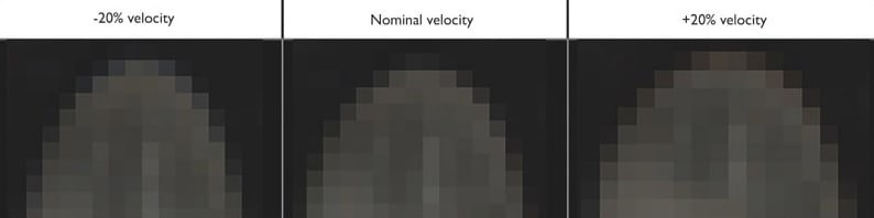 Assuming the parameters of the velocity distribution of white rice, we can acquire image data with the linear stage setup at different speeds. For testing, we considered average velocity +/-20%. We performed the experiment for the trilinear and the prism-based cameras using an identical scan scene.