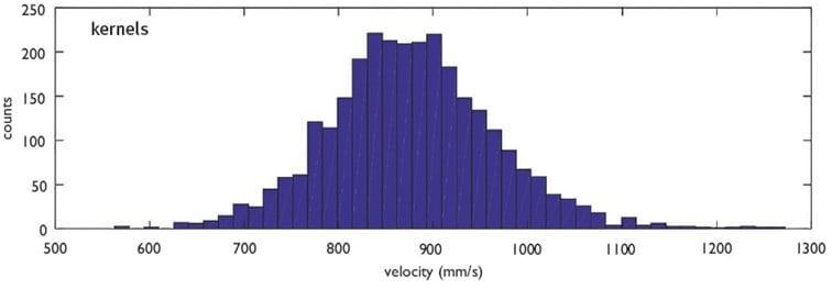 We analyzed the individual particle speed of bulk material on the inclined plane setup for the case of white rice samples. This was done by blob analysis of the line-shift of each rice kernel of a scanned image. The resulting velocity distribution is illustrated in Figure 5.