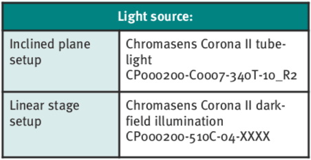 Two configurations were tested. The first is the inclined plane setup (see Figure 3, left side). The inclined plane setup is a worse case than the free-falling bulk material, as the velocity distribution of the bulk material particles is larger. The second configuration is the linear stage setup (see Figure 3, right side), in which the bulk material is distributed on a plane that is then moved under the camera. This setup allows adjusting the movement velocity in a controlled fashion. In that way, it is possible to do a one-to-one comparison of individual material particles with both camera types for different velocities.