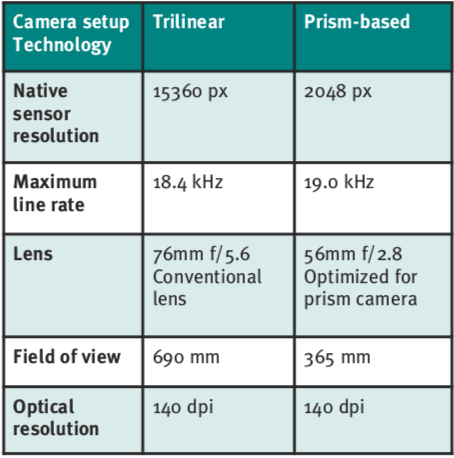 The Chromasens allPIXA wave that was used in testing has a pixel pitch of 10.2 μm and a pixel size of 5.6 μm, resulting in reduced color fringe compared to trilinear cameras that have larger pitches and pixel sizes.