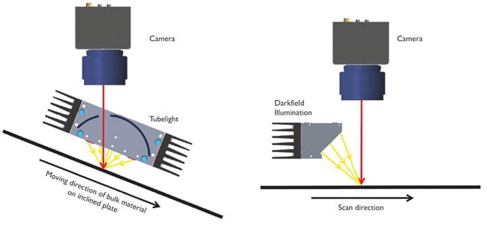 There exist various manufacturing applications where bulk materials are required to be inspected in an automated fashion at high speed. Industrial cameras, especially with line-scan camera technology, are very well suited for the typical high velocity at which the bulk material moves. In the simplest case, a line-scan camera consists of a single linear line of sensor cells. A two-dimensional image similar to an image from an area sensor is created by moving the scan scene perpendicular to the sensor while acquiring successive lines of the image. The single-line sensor can produce a single-channel image, typically in grayscale. However, many bulk material inspection applications require color images. There exist two types of technologies to acquire full-color images: