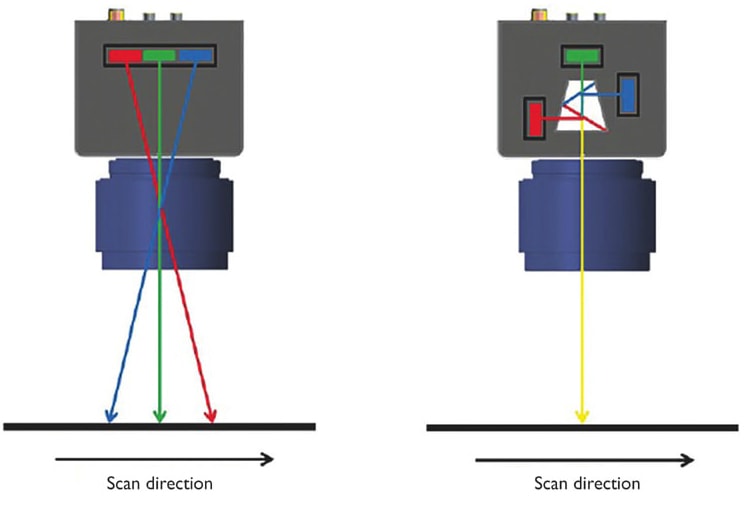 In the case of the trilinear sensor, the three image lines of a single object point are acquired at different moments in time with the resulting channel-shift in transport direction typically corrected internally. For a perfect correction the scan object velocity needs to be constant and precisely predetermined. In the case of a prism-based camera, the three image channels are acquired at the same moment in time and therefore no extra correction is needed. (Figure 1)