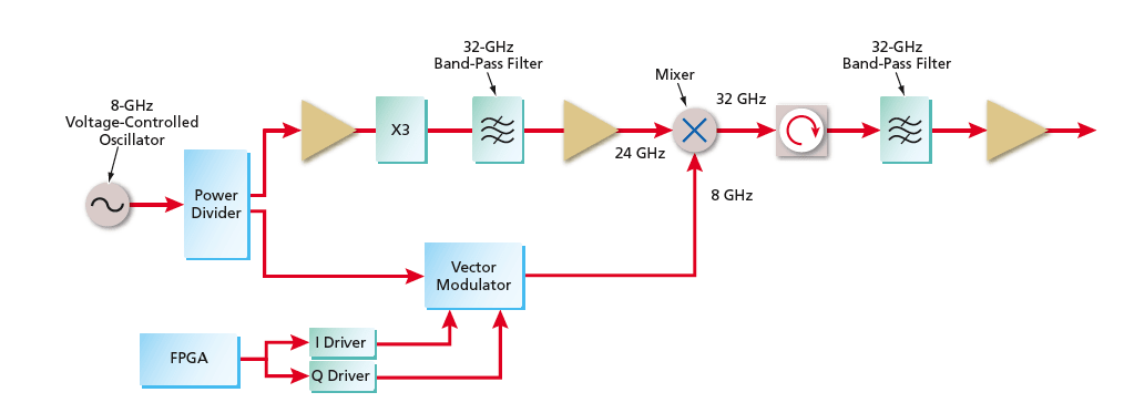 The 24-GHz output of the frequency-multiplier path and the 8-GHz output of the modulator path are combined in a mixer to obtain the desired modulated 32-GHz signal. The performance of the mixer is improved by including an isolator in its output path. The isolator output is coupled through a 32-GHz band-pass filter to an output amplifier.