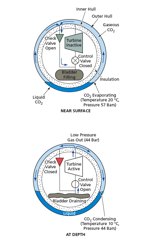 Upon descent, the outer hull would become cooled — possibly to a minimum temperature as low as about 4 °C at a depth of about 300 m. The cooling would reduce the pressure of the CO2 remaining in the annular volume to about 44 bars (4.4 MPa) or less. Then a control valve would be opened, allowing CO2 from the pressurized bladder to expand through a turbine, thus producing electricity for recharging the battery. After flowing through the turbine and the control valve, the CO2 would enter the annular volume, where it would be condensed at low temperature and pressure, completing the thermodynamic cycle.