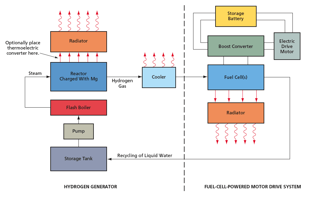 Only a small fraction of the heat generated in the reaction would be needed for boiling: For every kilogram of hydrogen produced, about 44.5 kW⋅h of heat would be generated, while only about 6 kW⋅h would be needed to boil the requisite amount of water. The remaining 38.5 kW⋅h of high-grade heat would have to be dissipated via a radiator. Optionally, the flow of heat from the reactor to the radiator could be intercepted by a thermoelectric converter, thereby increasing the overall electric power generated; the net increase in the overall efficiency of the fuel-cell power system has been estimated to be equivalent to that afforded by an increase of 19 percent in the amount of hydrogen generated.