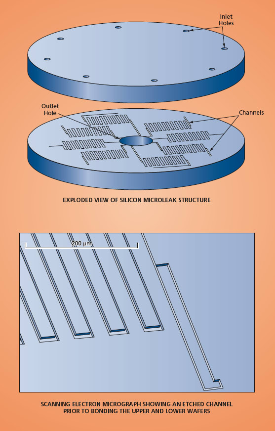Silicon microleaks have potential for additional device functionality. For example, resistance heaters could be integrated into silicon microleak structures to enable heating of inlets to vaporize droplets to prevent clogging. Thermistors could also be integrated into silicon microleak structures for monitoring their temperatures. Yet another device concept is that of a one-shot-closing valve: an integrated resistance heater would be used to momentarily melt a microscopic piece of a suitable metal positioned near a channel to cause the metal to flow into, and thus plug, the channel. If all of the multiple channels in a silicon microleak structure were equipped with one-shot-closing valves, then the valves could be actuated, one at a time, to effect stepped reductions in the overall conductance of the microleak.