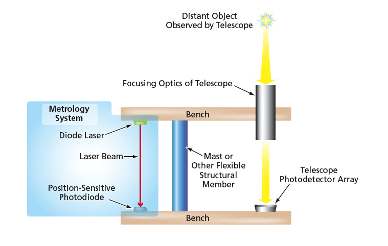 The proposed system would include three diode lasers that would be mounted on the focusing-optics bench. For clarity, only one laser is shown in the figure, which is a greatly simplified schematic diagram of the system. Each laser would be aimed at a position-sensitive photodiode that would be mounted on the detector bench alongside the aforementioned telescope photodetector array. The diode lasers would operate at a wavelength of 830 nm, each at a power of 200 mW. Each laser beam would be focused to a spot of ≈1-mm diameter on the corresponding position-sensitive photodiode. To reduce the effect of sunlight on the measurements, a one-stage light baffle and an 830-nm transmission filter of 10-nm bandwidth would be placed in front of the position- sensitive photodiode. For each metrology reading, the output of the position-sensitive detector would be sampled and digitized twice: once with the lasers turned on, then once with the lasers turned off. The data from these two sets of samples would be subtracted from each other to further reduce the effects of sun glints or other background light sources.