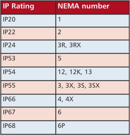 Sealing typically relies on a tongue-and-groove construction between the mating halves; for higher levels of sealing, a compressible gasket will also be used at the interface. The relevant international standard is IEC 60529. Typically, enclosures rated at IP54 are suitable for general-purpose use; for installation in environments where dust and water are likely to be present, IP66, 67, or 68 would normally be specified. The highest rating is IP69K, which gives protection against steam cleaning at high pressure. In North America, enclosures’ environmental sealing is normally defined as a NEMA (National Electrical Manufacturers Association) number. NEMA ratings also require additional product features and tests (such as functionality under icing conditions, enclosures for hazardous areas, knock-outs for cable connections, and others) not addressed by IP ratings.