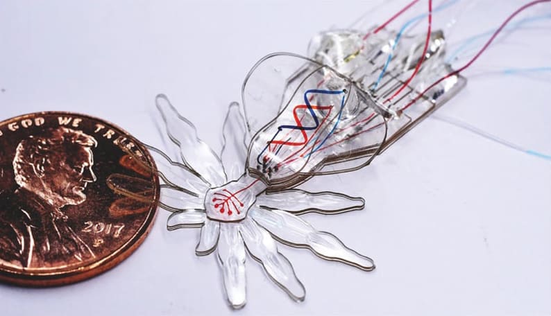 In the future, soft, animal-inspired robots may be safely deployed in difficult-to-access environments in which rigid robots cannot currently be used such as inside the human body or in spaces that are too dangerous for humans to work. Centimeter-sized soft robots have been created, but thus far it has not been possible to fabricate multifunctional flexible robots that can move and operate at smaller size scales.