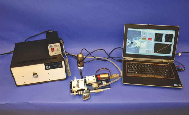 The system includes a linear encoder with a 1-μm resolution to act as a feedback loop that enables the system to make automatic adjustments, reducing operator time. The tester allows interchangeable use of force cells ranging from 10 g through 1 kg. Data obtained during testing is recorded using a bus-powered data acquisition device capable of 16-bit resolution, 250,000 samples/second, and a ±10 voltage range. This data can be used to determine the cyclic degradation of the springs over a lifetime.