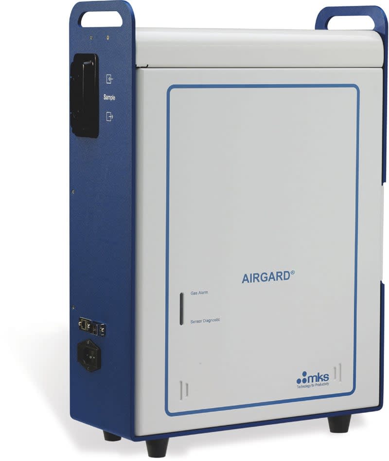 The MKS AIRGARD® Air Analyzer is an advanced CWA and TIC detector based on an FTIR spectrometer. The AIRGARD is a complete self-contained system that is typically wall-mounted and only needs power and a communication connection to local command systems. Experts determine the optimum location in buildings for the system based on the flow of personnel and air flow modeling or experiments. Systems may be installed to measure the air circulated through a building's ventilation or HVAC system, allowing operators to stop or divert air flow if detection occurs. Figure 2 shows the MKS AIRGARD® analyzer.