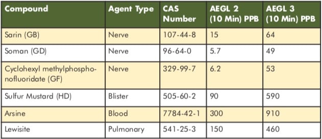 Chemical Warfare Agents can result in death or severe injury after even short exposures at very low concentration levels. Table 1 lists the Acute Exposure Guideline Levels for several CWA. The AEGL2 (10 minutes) indicates the concentration that results in irreversible or other serious, long-lasting effects or impaired ability to escape. The AEGL3 indicates the concentration at which life-threatening effects or death occur.