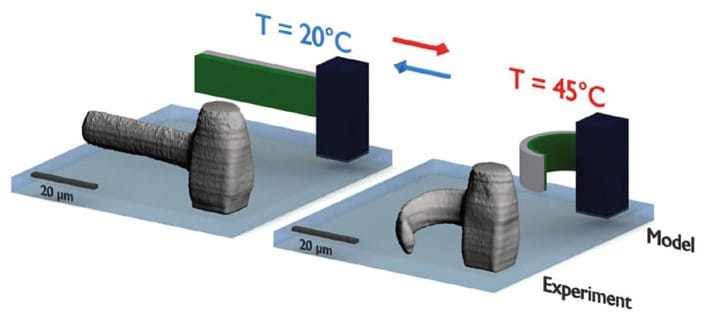 The method can be used to manufacture complex structures in which, as a result of external stimulation, the moving parts do not all react in the same way, but show different but precisely defined reactions. This is made possible by grayscale lithography, where the photoresist is not exposed with the same intensity at all points but is exposed in a graded manner. This allows the desired material properties, and thus the strength of the movement at a certain temperature change, to be set very precisely. With computer simulations, the resulting movements can be precisely predicted and therefore allow a rational design of complex 3D structures.