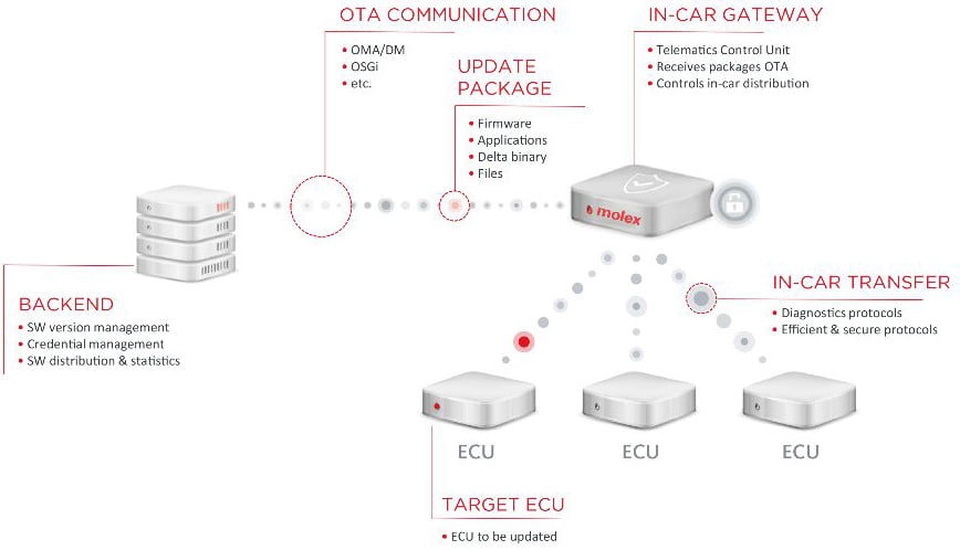 From a technical perspective, any control unit equipped with mobile radio can function as the FOTA gateway. The Telematics Control Unit (TCU), however, is better equipped for this task than other units. The head unit, for instance, is an integral part of many vehicles, too, and additionally, it has sufficient storage space and processing power. Most head units, however, include numerous wireless interfaces.