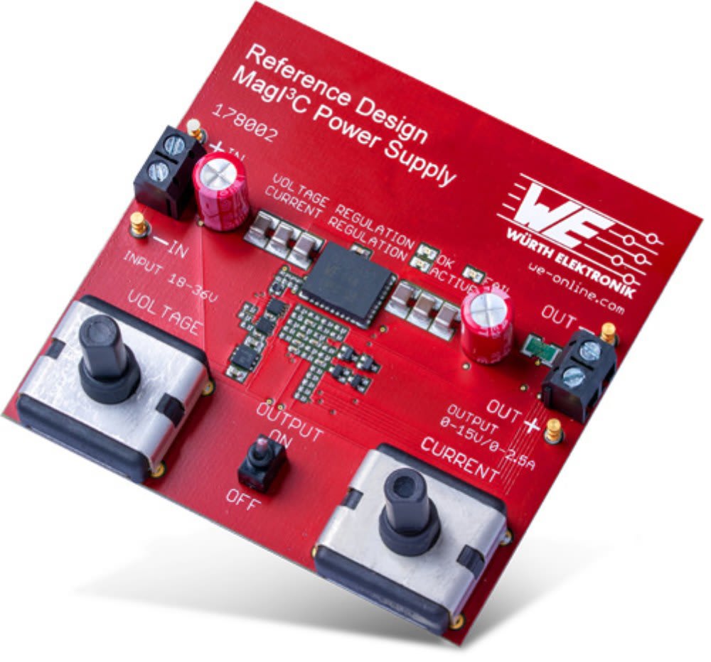 MagI3C Power Modules from Würth Elektronik, Waldenburg, Germany, are DC/DC converters with integrated controller IC, inductors, and capacitors. The board is based on the MagI3C VDRM (Variable Step Down Regulator Module) to which two additional control loops have been added. The reference design generates a constant voltage with an adjustable maximum current or maximum voltage. Output voltage can be set from 0 to 15 V and current from 0 to 2.5 A. LEDs indicate voltage regulation mode, current regulation mode, and a missing output voltage.