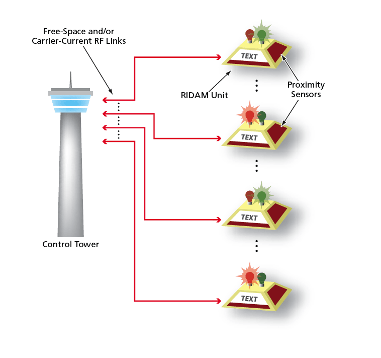 The illuminated sign could display stop/go signals or other short alphanumeric text messages to pilots of aircraft awaiting further clearance. The RIDAM unit would include one or more proximity sensors in the form of short-range radar, lidar, or video units that would generate movement-confirmation signals: that is, they would monitor positions of aircraft and ground vehicles and send information on those positions to the control tower. The RIDAM unit could include a transceiver that would interact with transponders on aircraft to identify or to confirm the identities of the aircraft. The RIDAM unit would periodically transmit, to the control tower, a “watchdog” signal, which would contain information on the statuses of the lights, sign, proximity sensor(s), and other components. A command processor in the RIDAM unit would automatically generate audible warnings to potential clearance violators and would both (1) broadcast the warnings locally via a short-range radio transmitter operating in a pre-existing aviation ground communication frequency band and (2) transmit the warnings to the control tower via the aforementioned free-space or carrier-current RF link.