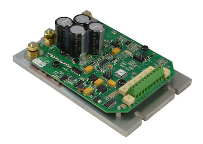 American Control Electronics (South Beloit, IL) introduced the DCR300-60 and DCR600-60 Series microprocessor-based, low-voltage PWM drives for brushed DC motors up to 24 and 48 VDC, respectively. The microprocessor allows for custom programming, potentially eliminating the need for a PLC and supporting devices. The drives are rated for 30 amps continuous operation or 60 amps for one minute. The regenerative controls are capable of braking or reversing on the fly, without the use of braking resistors or motor lead swapping. The drives are equipped with a brake output that can be used to power electromechanical brakes or an external run status LED. There are two onboard LEDs that communicate run status and fault conditions. Jumpers select between speed or torque mode operation, as well as unidirectional or bidirectional control with a 0-5 VDC analog signal.