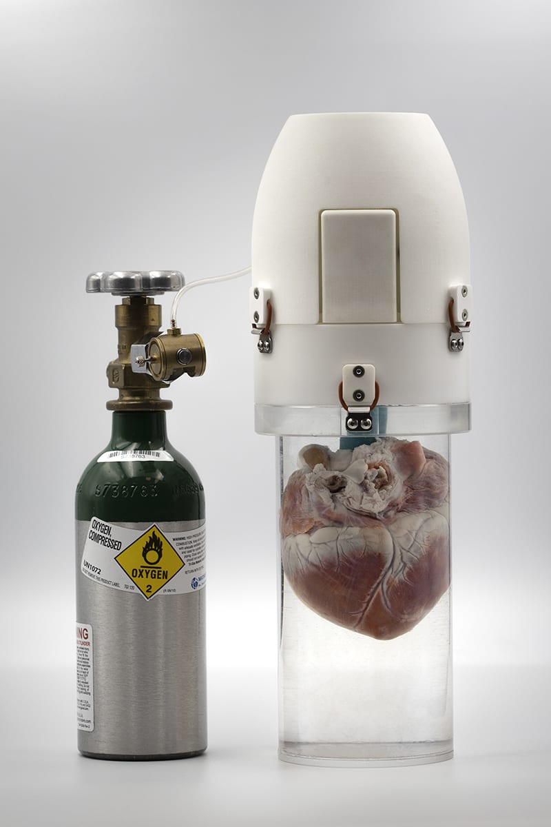 Through gas pressure, the nutrient-rich fluid is pulsed into the organ and then vented into a canister within the device. The solution is recycled and returned to the top part of the system where it is reoxygenated, filtered, and sent back through the tissue again and again.