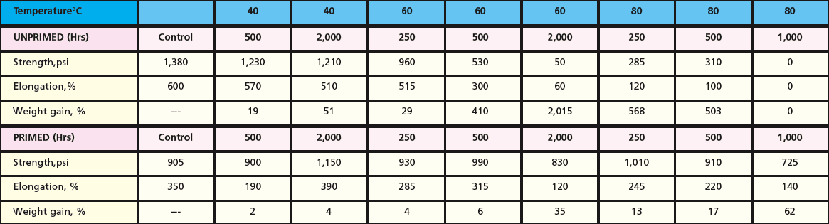 The amount of water absorption in specimens containing glass beads is dramatically changed by the presence of the primer, particularly in the specimens immersed in water at the 80 °C temperature. Unprimed specimens aged in water at 60 °C for 2,000 hours showed a 2015- percent increase in weight, whereas primed glass bead specimens gained only 35 percent. Reduction in tensile strength also followed primed and unprimed specimens, and increasing exposure times and temperatures.