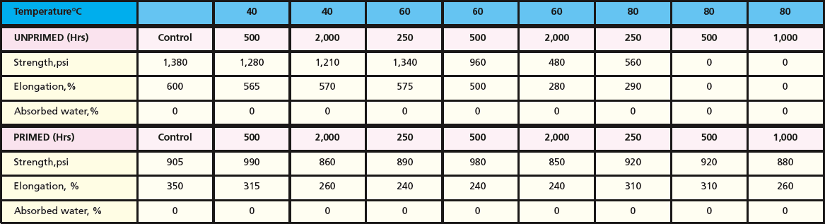 Table 1 provides strength and weight gain data for primed and unprimed specimens after water immersion at 40, 60, and 80 °C. Cured EVA rubber containing no glass beads gained only 1 weight percent water. This shows that the immense weight gain of other specimens is due to water absorption at the glass/elastomer interface. This was also verified by FTIR (Fourier Transform Infrared) spectroscopy.
