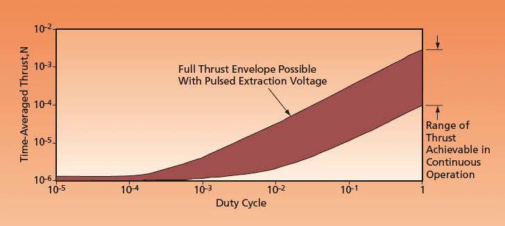 The present electronic drive circuitry generates the extraction voltage in pulses. Pulse-width modulation can affect rapid, fine control of time-averaged impulse or ion flux down to a minimum level much lower than that achievable in continuous operation (see figure). Since there is little or no need for upstream regulation to affect fine control, the upstream operational parameters can be held constant and, therefore, much of the control subsystem heretofore needed for upstream regulation can be simplified.