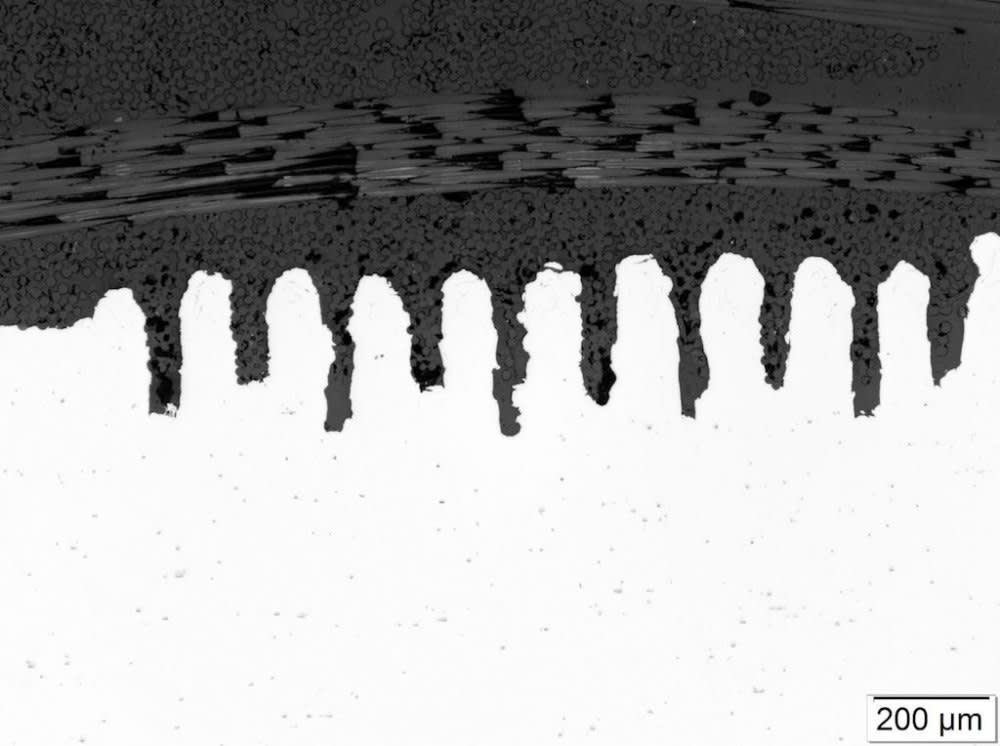 The bond is especially strong because of a pre-treatment of the metal. The process, known as laser ablation, removes material as deep as 100 micrometers, creating a pattern of laser-etched anchoring structures.