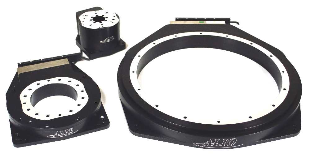 ALIO Industries (Arvada, CO) introduced TRUE NANO® mechanical rotary stages with crossed roller bearings for improved stiffness for offset loads and rotational precision. Integrated with servo torque frameless motors, the stages can handle applications with extreme mass and acceleration while maintaining nanometer-level precision. Standard stages have 0.2 arc-second repeatability using supplied motion controllers. Standard mechanical crossed roller bearings are rated at 13 to 20 microns of radial and axial run-out, with optional runouts of certain models below 5 microns. The family consists of multiple motor sizes to meet duty cycles as well as mass and acceleration needs from 80 to 300 mm in diameter. Vacuum rotary union options are available on the inner diameter for mounting a vacuum chuck.