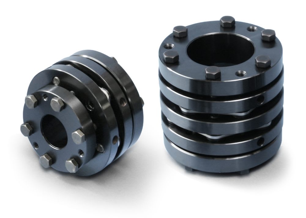 Miki Pulley (Plymouth, MN) offers SFM couplings for high-speed power transmission applications up to 24,000 rpm where high torque and precision alignment are critical. Available in 10 sizes, the couplings transmit torque by connecting two shafts while damping system vibrations and accommodating misalignment. The couplings have a disk spring design that provides high torsional rigidity and axial flexibility. The high-response, zero-backlash design features a high torque-to-weight ratio. The couplings have a torque rating from 60 N•m to 600 N•8, depending on model size. Torsional stiffness ranges from 104,000 Nm/rad to 970,000 Nm/rad with parallel misalignment of 0.02 mm.