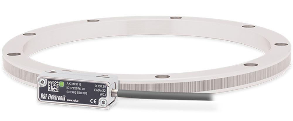 RSF Elektronik, a HEIDENHAIN company (Schaumburg, IL), offers a kit angle encoder for motion feedback in robotics, semiconductor, medical, and machine tool applications. The encoder is available in absolute (MCR 15) and incremental (MSR 15) versions. Both models consist of an optical scanning unit and a separate full circle drum with the graduation on the outer diameter. The encoders are available in several sizes of drums, from an inside diameter of 40 mm up to 330 mm. The drums come with accuracies starting at 20 arc seconds with up to 10 arc seconds, depending upon diameter. Resolutions are also diameter-based and range from 22 to 25 bits for the absolute versions. Maximum revolutions per minute on the large diameter is 870, and the smallest diameter can be spun up to 12,200 times per minute.