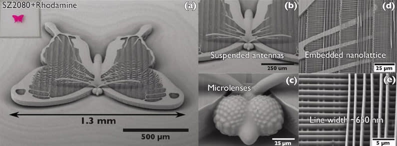 Since MPS has a higher resolution compared to other AM fabrication methods, it has been used to manufacture mesoscale structures and large lenses. Mesoscale structures have an overall size of up to centimeters but with micro-or nanosized features. To demonstrate MPS capabilities in the fabrication of mesoscale structures, a large butterfly (in the range of a millimeter) with micro- and nanoscale features is shown in Figure 5[4] Mesoscale lenses have a wide range of applications, such as ophthalmology and imaging systems.