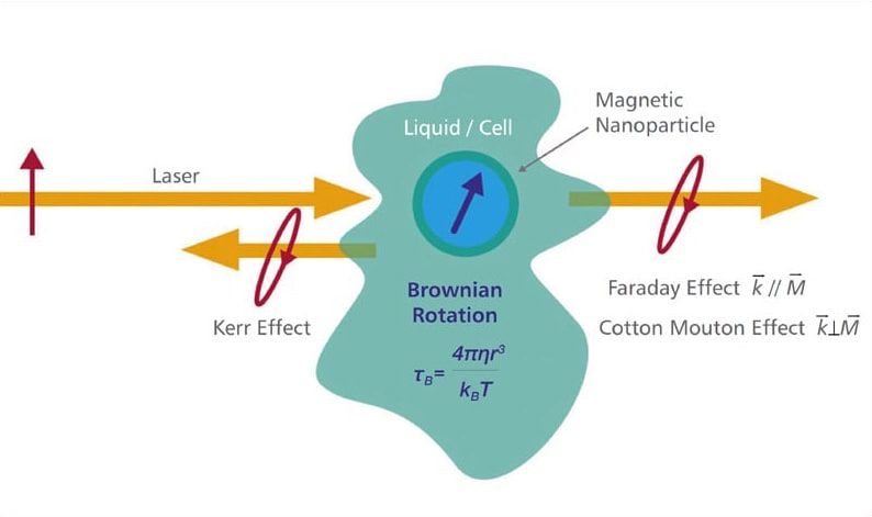 Researchers have developed a magnetic-optic biosensor that uses biofunctionalized magnetic nanoparticles. The long-range interaction between magnetic nanoparticles and an external magnetic field enables manipulation and sensitive detection of those particles for improved biosensors. The process involves applying a time-varying external magnetic field and a linearly polarized incident laser light to a suspension of magnetic nanoparticles. The resulting transmitted or reflected light and its polarization are recorded with a photodetector. This allows for the determination of the Brownian relaxation time, which may indicate hydro-dynamic radius changes upon chemical binding of the target to the magnetic nanoparticles.