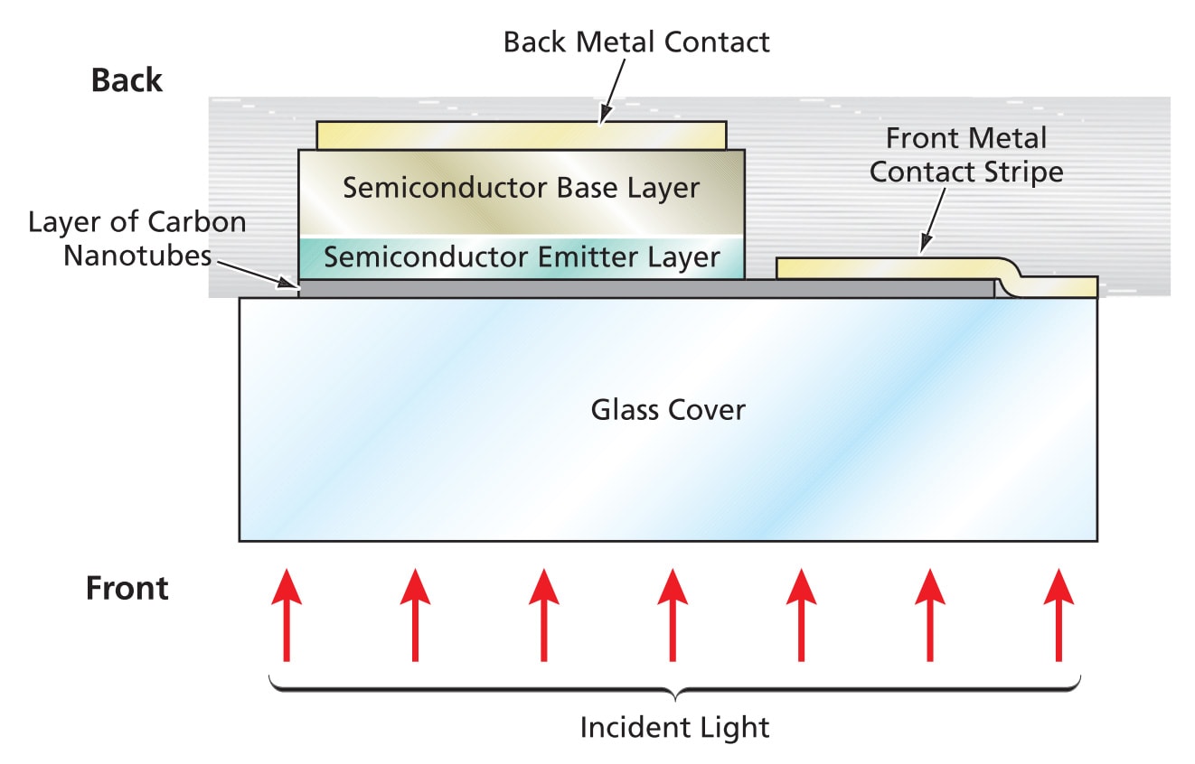 During fabrication, the layer of carbon nanotubes could be deposited (e.g., from a liquid suspension) onto either the front surface of the solar-cell emitter layer or on the glass cover prior to attachment of the cover by use of an adhesive. In either case the carbon nanotubes would adhere to the deposition surface by means of van der Waals forces.