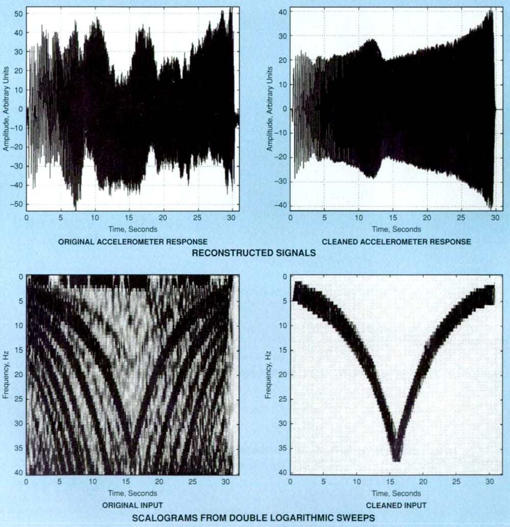 An example of filtering the undesired features of more-complicated input/output signal pairs in the time-frequency representation involves the use of a double logarithmic sweep from an excitation system. The bottom part of Figure 2 contains planar scalogram (map of CWT coefficients) that pertain to this example. Harmonics from train-gauge input measurements can be detected readily in the left scalogram. The presence of these harmonics indicates nonlinear exciter-vane response from rotating slotted cylinder at the wing tip . Such nonlinearity is deemed undesirable for subsequent analysis by linear state-space identification methods. Therefore, the input signal is processed by (a) extracting the desired time-frequency map from the left scalogram, yielding the right scalogram, then (b) reconstruct- ing the time-domain input signal from the data represented by the right scalogram.