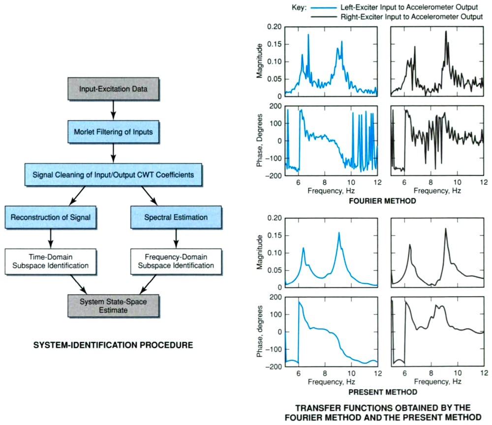 Transfer functions are used in structural dynamics to acquire state-space representations of the system modal dynamic, to determine stability estimates with standard methods, and to predict flutter boundaries with more advanced techniques. Traditional Fourier-transform methods involve averaging, windowing, and other procedures that often disguise important features in data. The pre ent method includes a recipe to circumvent this deficiency by utilizing a wavelet-based feature-extraction filter to estimate cleaner transfer functions based on localization in frequency and time. The left part of Figure 1 schematically depicts a system-identification procedure (including a procedure for constructing transfer functions) according to the present method.
