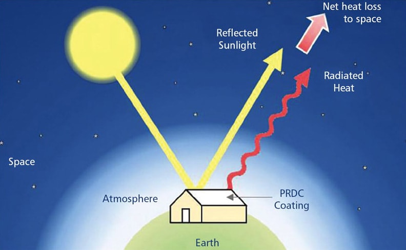The polymer coating's high solar reflectance and high thermal emittance keep it significantly cooler than its environment under widely different skies, e.g. by 6 °C in the warm, arid desert in Arizona and 3 °C in the foggy, tropical environment of Bangladesh.