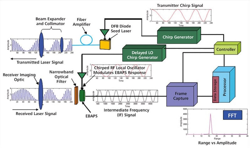 The system can acquire, process, and display 3D imagery in near real time, including near-real-time frame-to-frame re-registration to compensate for platform and target motion. The system provides improved LADAR design with greater modulation depth across the chirp bandwidth, a more compact chirp generator, and improved thermal management.