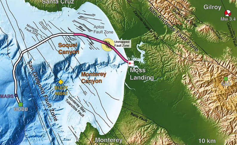 The cable stretches 52 kilometers offshore to the first seismic station ever placed on the floor of the Pacific Ocean, put there 17 years ago by the Monterey Bay Aquarium Research Institute. A permanent cable to the Monterey Accelerated Research System (MARS) node was layed in 2009, 20 kilometers of which were used in this test while offline for yearly maintenance.