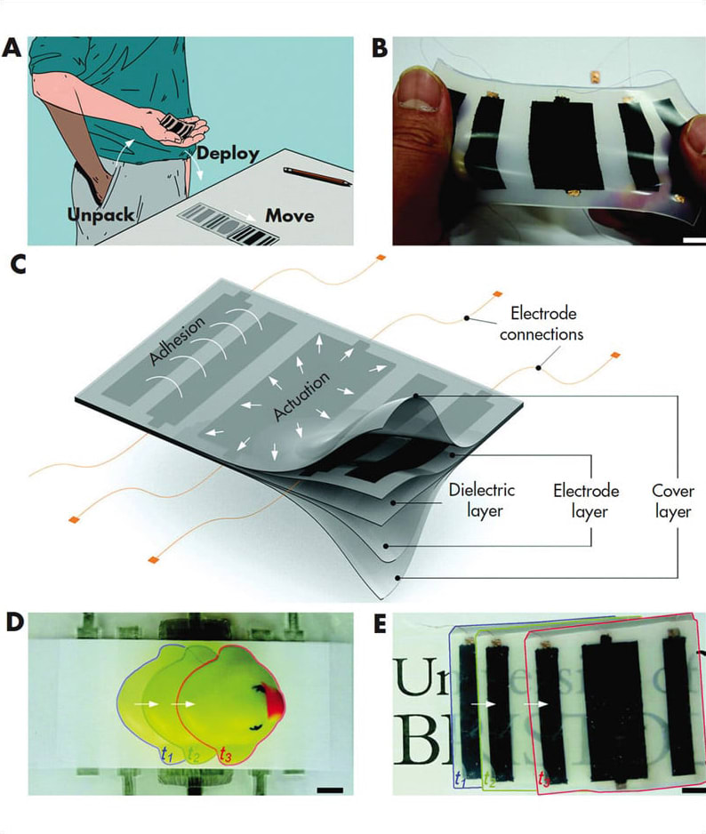 Traditional robots are rigid and incompliant, whereas soft robots are compliant and can stretch and twist to adapt to their environments. Until now, soft robots have separated their movement abilities from their capabilities to grip the surface they move on. Taking inspiration from biological skins and soft organisms like snails and slugs, researchers demonstrated a new robotic skin that crawls across a surface by alternately contracting embedded artificial muscles and gripping the surface using electrical charges.