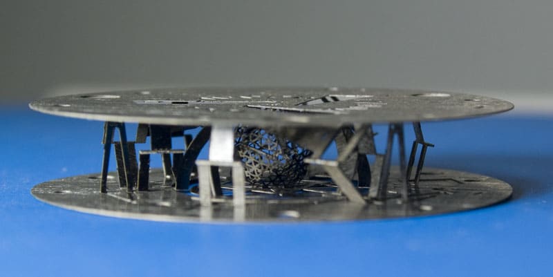 Sheets of various laser-cut materials are layered and sandwiched together into a thin, flat plate that pops up into the complete electromechanical structure, creating complex, articulated mechanisms with potential uses in robotic research and design, and in electronic and medical applications.