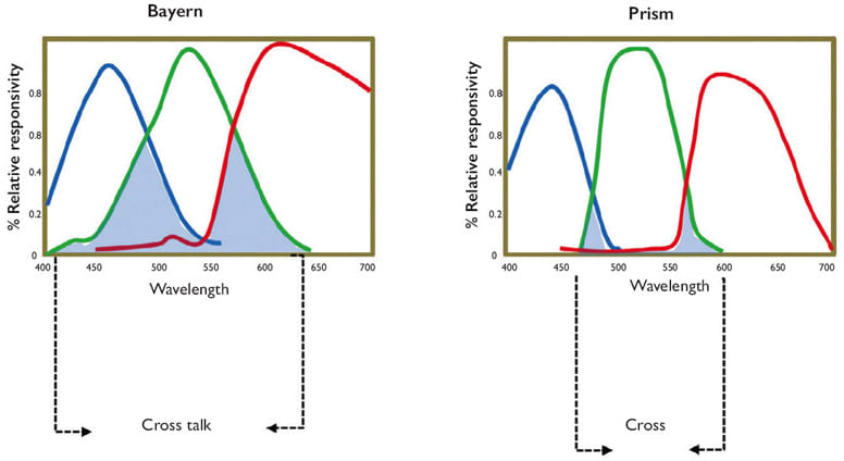The curves in Figures 3-5 differ essentially in the slope steepness. Due to the dichroic filters used, the curves in Figure 5 are much steeper than in Figures 3 and 4. The camera manufacturer with the Figure 5 curves argues that the steepness of the flanks allows good color separation.